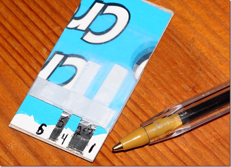 I used two pieces of cardboard from a potato chip box because it makes it thicker to fit into the slot. One inch wide by about 2 inches long. At a forum I belong to someone said you could also use an old credit card because it’s thicker, I haven’t tried that method but it sounds good.
